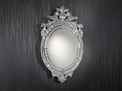 Зеркало с фаской в раме из стеклянных пластин с фаской и с узорной гравировкой, установлено на основе из дерева и MDF чёрного цвета.