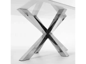 Обеденный стол с ножками из нержавеющей стали и столешницей из белого лакированного МДФ.