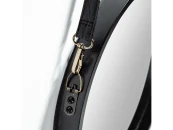 Круглая форма — это еще одно замечательное свойство. Изделие не нужно долго примерять к стене, выбирая угол наклона. Достаточно подобрать оптимальную высоту и на этом уровне забить гвоздь. Подвес выполнен из кожи. Это прочный и долговечный материал, имеющий эстетичный внешний вид. С обеих сторон он крепится к зеркалу при помощи карабинов, которые при желании можно отстегнуть. Для чего это нужно? Дизайнеры грамотно предусмотрели максимально удобный способ протирания зеркала — в руках.