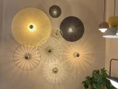 Настенное бра, выполненное из мателла и ротанга в современном стиле. Состоит из металлического фиттинга размером 5 см хромового цвета и рассеивающего диска из ротанга 30 см в черном цвете.