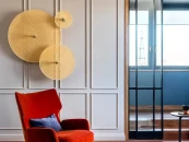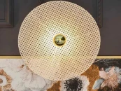 Настенное бра, выполненное из мателла и ротанга в современном стиле. Состоит из металлического фиттинга размером 10 см золотого цвета и рассеивающего диска из ротанга 60 см в натуральном цвете.