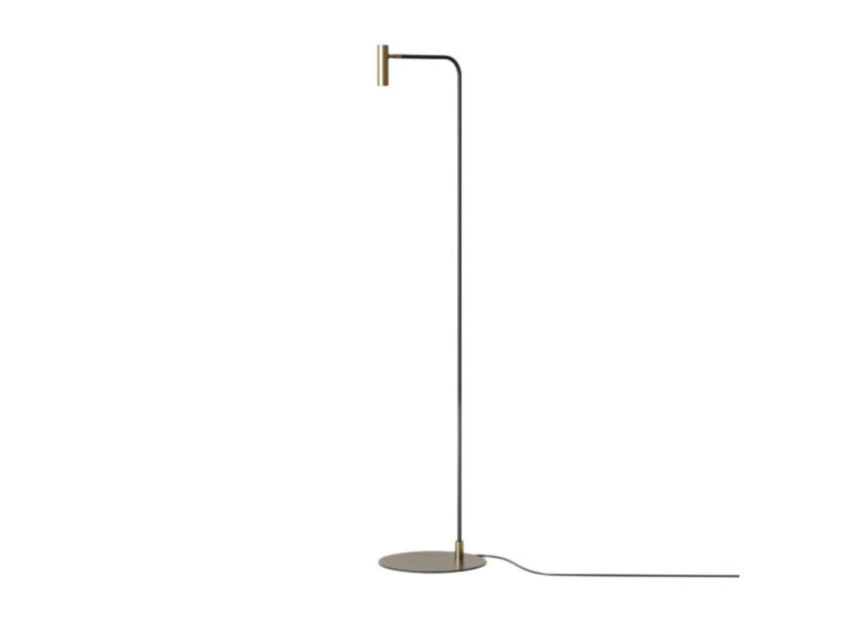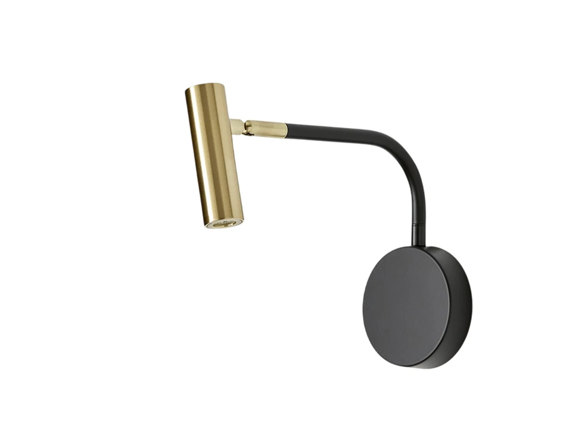 Дизайнерский настенный светильник с матовой черной металлической основой и регулируемым металлическим плафоном с латунной или матовой черной отделкой. С поворотным механизмом и сенсорным выключателем. Светодиод включен.