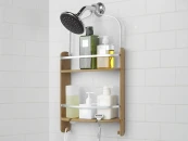 С вами случалось, что вы стоите под душем, в пене, и вдруг понимаете, что потеряли мочалку? Или шампунь или любую другую мелочь, которая лежит где-то в ванной. С таким гениальным органайзером всё будет под рукой. Две вместительные полочки, на которых помещаются даже очень большие бутылки с шампунями и гелями. В каждой предусмотрены отверстия, чтобы перевернув пузырек вверх ногами, вы использовали его как диспенсер. В нижней полке есть специальные отверстия для хранения бритвенных станков. Два крючка снизу, чтобы повесить мочалки. Прочная основа из бамбука удерживает большой вес, а металлический держатель со специальным силиконовым крючком позволит повесить органайзер на крепление для душа или штангу для шторки в ванной.