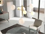 Подвесной светильник из матовой латуни или черной стали с абажурами из непрозрачных или прозрачных стеклянных шариков. Светильники можно перемещать парами, чтобы вы могли решить, какое положение вам больше нравится. В комплект входят восемь светодиодных ламп G9 мощностью 5Вт 2700К.