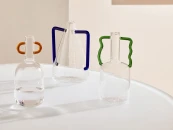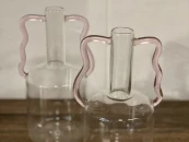Ваза из прозрачного и розового стекла. Дизайн с абстрактными ручками.