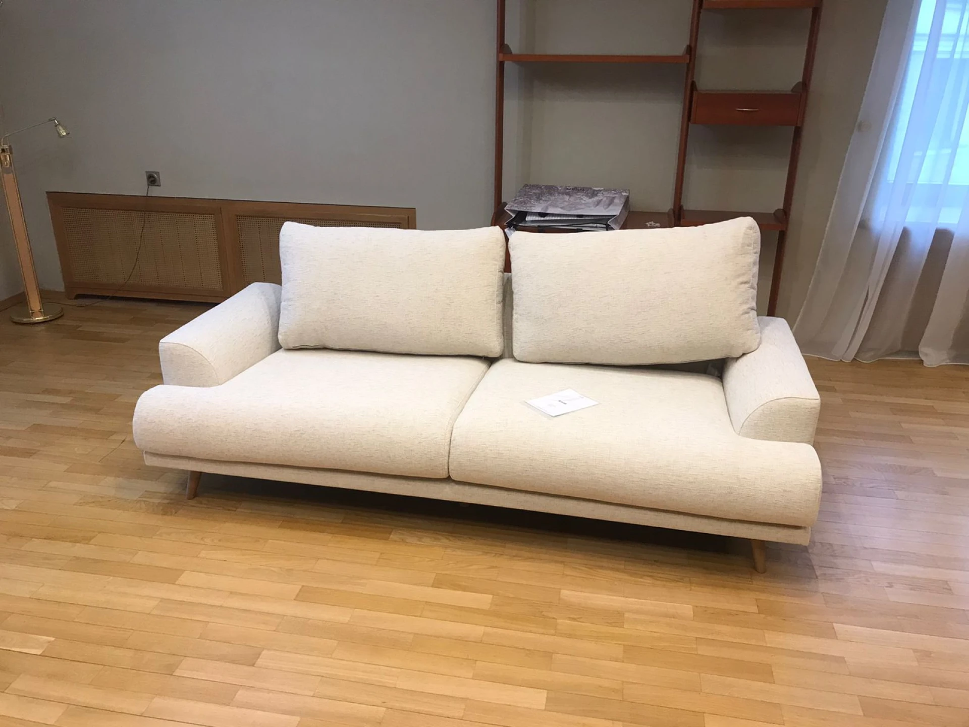 Трехместный диван с обивкой из толстой синели с защитой от пятен. Набит переработанным ПЭТ-волокном. Съемные чехлы сиденья и спинки. Легко чистящаяся ткань. Ножки из массива бука с отделкой из орехового дерева.