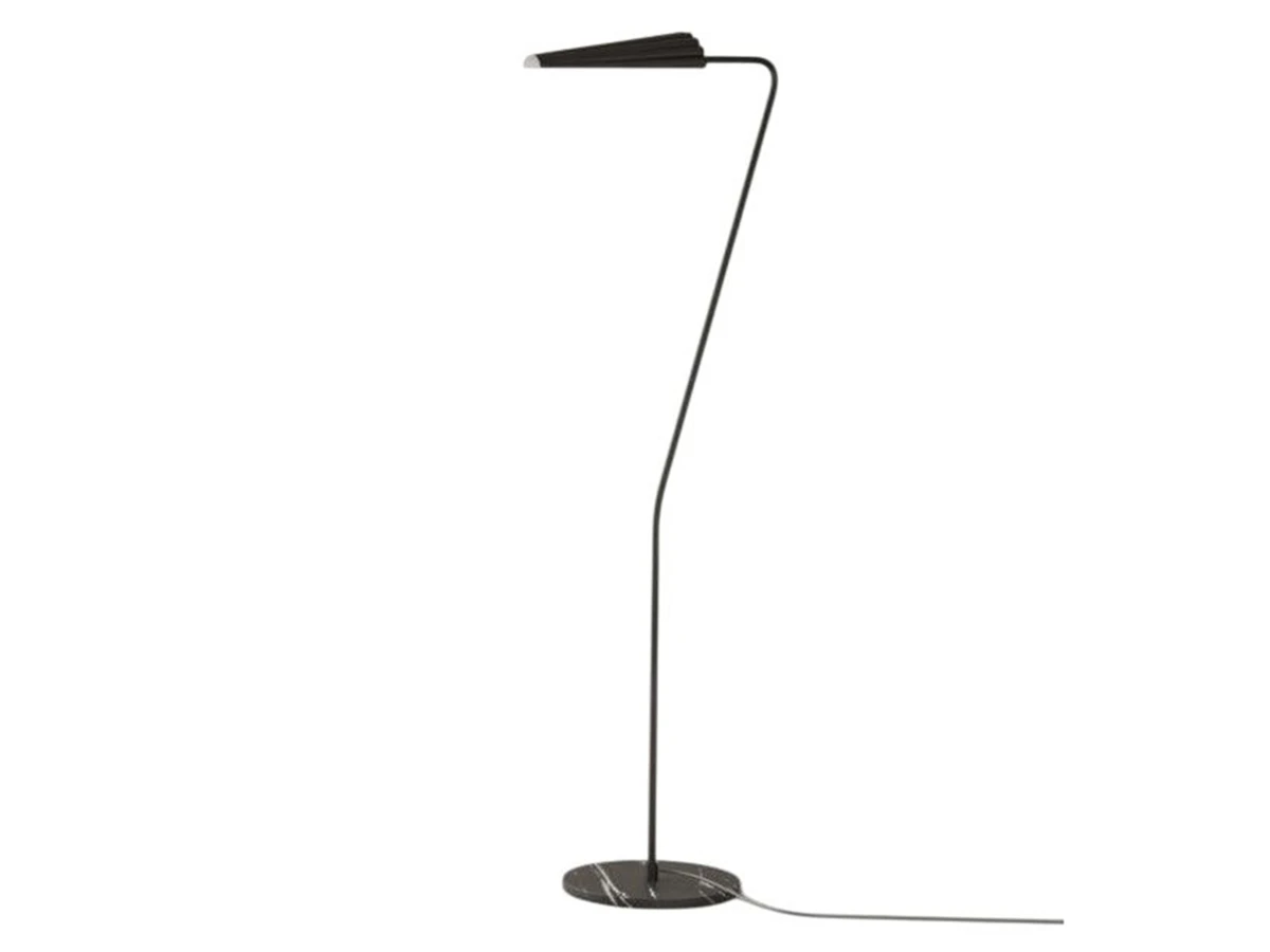 Лампа имеет металлическую трубчатую структуру, которая с одной стороны закреплена на мраморном основании, а с другой вставлена в плафон. Угол наклона между плафоном и ножкой – 30 градусов.