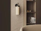 Настенный светильник, выполненный из металла в черной отделке и абажуром из натурального льна.