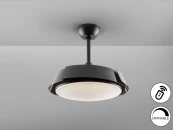 Потолочный вентилятор со светодиодной подсветкой. Изготовлен из металла с матовой черной отделкой и деревянных лезвий с отделкой под орех. Рассеиватель из опалового стекла. Вентилятор с двигателем постоянного тока с реверсом. Светодиод CCT трехцветной цветовой температуры. Таймер.
