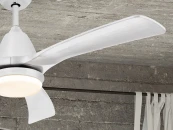 Потолочный вентилятор со светодиодной подсветкой. Изготовлен из металла и дерева с белой отделкой. Рассеиватель из опалового стекла. Двигатель постоянного тока с реверсом. Светодиод CCT с трехцветной цветовой температурой. Таймер. Система фиксации против раскачивания.