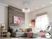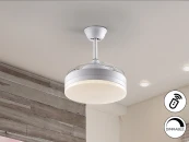 Потолочный вентилятор со светодиодной подсветкой и CCT (регулируемая температура света). Изготовлен из металла и акрила, имеет матовую белую отделку. Опаловый акриловый рассеиватель. Двигатель постоянного тока, 6 скоростей и реверс. Таймер, ветер и функция памяти.