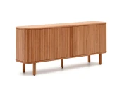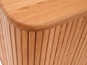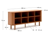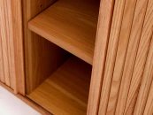 Для эстетичного и притягательного вида – великолепный шпон с идеальной фактурой. Сервант полностью сделан из натуральной древесины. Сверху он отделан шпоном ясеня в темном или натуральном цвете. Внутреннее наполнение – восемь ячеек размером 23 на 23 см. Закрывают их раздвижные двери с реечной фактурой. Серван установлен на пять круглых ножек. У каждой есть регулируемый наконечник для улучшения устойчивости.