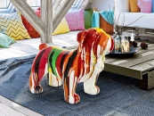 Фигурка бульдога среднего размера, изготовлена из смолы. Подходит для улицы. Оформление: глянцевая белая краска с цветными струями.