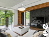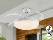 Потолочный вентилятор со светодиодной подсветкой и CCT (регулируемая температура света). Изготовлен из металла с матовой черной отделкой и акриловых лезвий с отделкой из орехового дерева. Опаловый акриловый рассеиватель. Двигатель постоянного тока 20 Вт, 6 скоростей и реверс. Таймер, ветер и функция памяти.