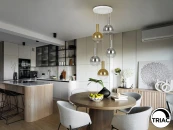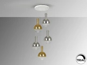 Лампа из металла, матового белого цвета. Абажуры из дутого стекла диаметром 20 см, цвета дымчато-серого мерцания и золотого мерцания. Регулируется по длине. Светодиод 30Вт, 2408 лм, 3000К.