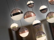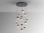 Лампа из 13 светодиодных лампочек, металлическая, черного цвета. Абажуры d12 и 15 см из дымчатого поликарбоната и мраморного стекла. Металлические кольца из меди, сатинированной латуни и черного хрома. РЕГУЛИРУЕМАЯ ЯРКОСТЬ. Светодиод 108 Вт. 3000 К. 5030 лм. В комплект входят драйвер TRIAC и НАБОР РЕГУЛИРОВКИ.