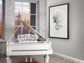 Белый классический бюст с наушниками, композиция с декоративной светодиодной полосой. Печатный холст, наклеенный на доску и оформленный в черную раму.