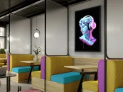 Цветной классический бюст с наушниками, композиция с декоративной светодиодной полосой. Печатный холст, наклеенный на доску и оформленный в черную раму.