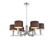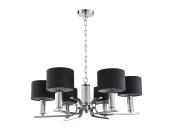 Декоративная подвесная люстра. Каркас цвета хром, плафоны из черной ткани, декоративные элементы из прозрачного стекла.