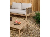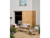 Alabe отличается универсальным и прочным дизайном, идеально подходящим для создания уютной атмосферы как в помещении, так и на улице. Его конструкция и синтетические шнуры из ротанга на сиденье устойчивы к ультрафиолетовым лучам. Древесина акации, из которой он изготовлен, выглядит тепло и естественно, а также имеет сертификат FSC 100%, который гарантирует ответственное лесопользование. Мы рекомендуем ежегодно наносить на него средство для защиты древесины Sterina, чтобы сохранить его внешний вид и продлить срок службы. Подушки, разработанные для обеспечения максимального комфорта, имеют пенопластовые и водоотталкивающие чехлы, что делает их идеальными для повседневного использования. Они также снимаются для легкой чистки, позволяя содержать весь комплект в безупречном состоянии. Под сиденьями расположены белые лямки, придающие сиденьям изысканность и дополнительную поддержку.