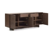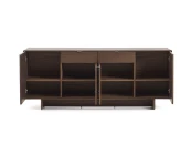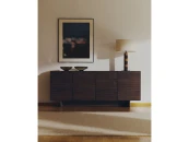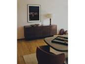 Norlen отдаёт дань уважения дизайну 1950х годов в современной интерпретации, сочетая минималистичные формы и винтажные детали. Слегка закруглённые углы и деревянное основание создают ностальгическую атмосферу, переосмысленную благодаря чистым линиям и современным пропорциям. Тёмный ореховый шпон, нанесённый методом вакуумной мембранной печати, идеально подходит к радиусам мебели, объединяя отделку и придавая глубину и индивидуальность каждому предмету. Он покрыт полиуретановым лаком, обеспечивающим устойчивость к износу и влаге.