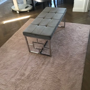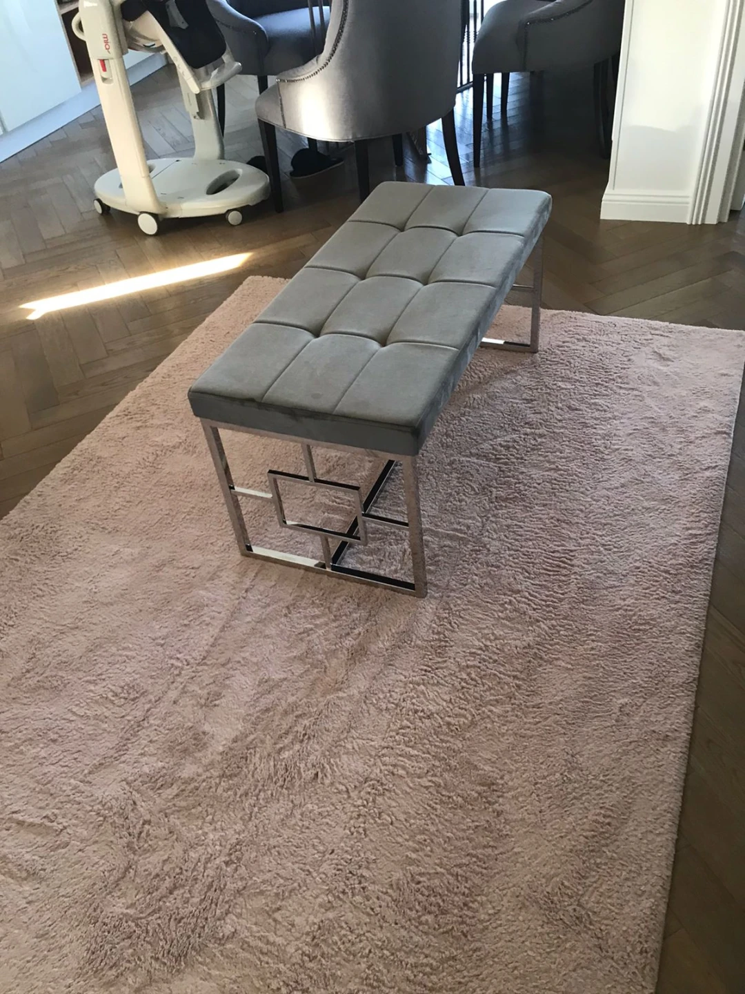 Банкетка из велюра отличаются прочностью и долговечностью. Обивка элегантного светло-серого цвета позволяет вписать ее практически в любой интерьер. Изящество и простота конструкции из полированной стали делает банкетку уместным и надежным предметом меблировки как для дома, так и для офисных помещений.