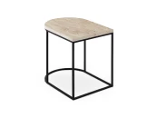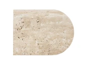 Материал столешницы - натуральный камень травертин, материал основания - металл черного матового цвета. Наличие подпятников, предохраняющие от появления царапин на полу.