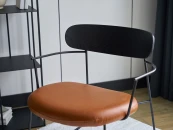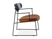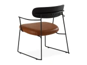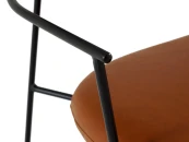 Материал обивки - экокожа коричневого цвета, материал ножек и каркаса - сталь с порошковым покрытием черного цвета. Материал спинки - массив дерева в шпоне дуба черного цвета. На ножках предусмотрены специальные подпятники, которые предотвращают скольжение и повреждения напольного покрытия.