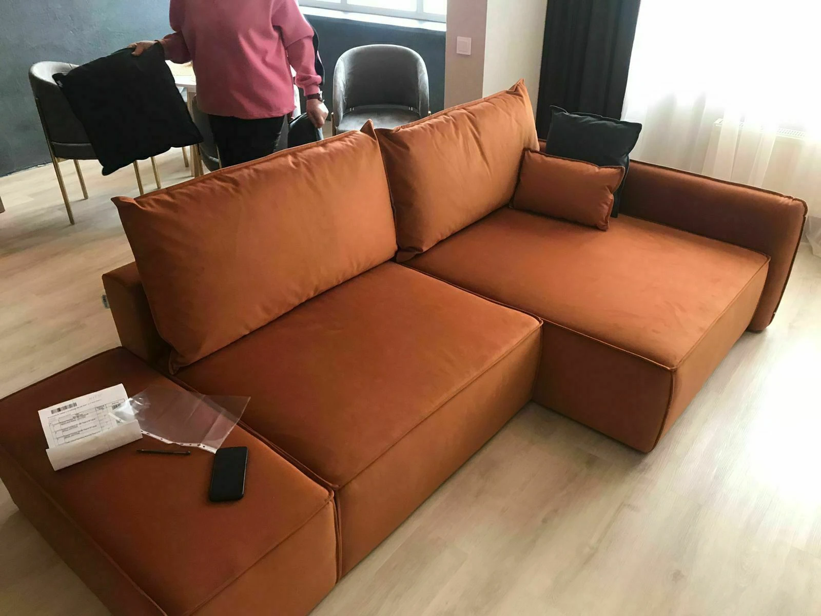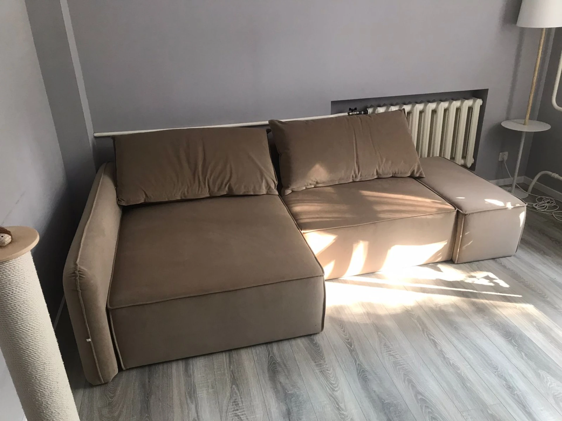 Обивка дивана - мягкий бархатистый премиальный велюр. Тонкая динамика узора обивки создаёт в пространстве ощущение лёгкости и движения. Технология Waterproof делает ткань устойчивой к влаге, и благодаря этому обивка долговечна и проста в уходе. Не впитывает жидкости, а загрязнения с нее удаляются легко и быстро. Обивка имеет повышенный уровень износоустойчивости 65 000 циклов (по тесту Мартиндейла). Ткань рекомендована для владельцев домашних животных.