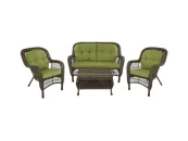 Шикарный комплект для отдыха (арт. АМ-520) из искусственного ротанга. Отличительная особенность данной модели - необычное плетение, имитирующее фактуру дерева, что позволяет ему выглядит как натуральный. В состав комплекта входят - кофейный столик с откидной крышкой, диван на 2 персоны, 2 широких кресла с удобными подушками зеленого цвета. - Каркас – металл, порошковая покраска. - Плетение – PE-ротанг (искусственный ротанг) высокого качества. - Подушки в комплекте. Ткань – полиэстер зеленого цвета. Наполнитель сидения - поролон, спинки - хлопковый очес. - Без стекла. Стол с откидной крышкой - дополнительное место для хранения. - Комплект поставляется в частично разобранном виде (стол).