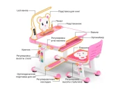 Одной из главных функциональных особенностей данного комплекта является наличие подставки для ног с изменяемым углом наклона. Ножки ребенка будут все время в комфортном положении и минимизируется нагрузка. Стол и стульчик регулируются по высоте. Отрегулировав высоту стола и стульчика в соответствии с ростом ребенка, необходимо закрепить надежным фиксатором, который выполнен в виде цветка и выглядит весьма эстетично и гармонично.