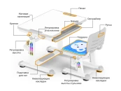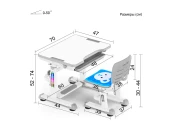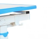 Высота стола регулируется в диапазоне 54-76 см, поэтому, комплект подходит для детей 3 - 14 лет. Высота стола, установленная в соответствии с ростом ребенка, надежно фиксируется специальными винтами с двух сторон. Угол наклона столешницы регулируется до 50 градусов, поэтому можно использовать данный стол, как мольберт, а также во время выполнения заданий можно чередовать положение сидя-стоя, так как в результаты исследований специалистов-ортопедов показали, что это благоприятно влияет на осанку, концентрацию и общее состояние ребенка. Каркас стола оснащен подвижной подставкой для ног, основная задача которой - минимизировать нагрузку на ноги, а также дополнительно увеличивает устойчивость всей конструкции стола. Подставка оснащена рельефной накладкой, которая минимизирует скольжение ног. Также, стоит отметить, что ножки стола со специальными регулируемыми накладками, чтобы нивелировать положение стола (например, если часть стола стоит на ковре, а часть на ламинате).