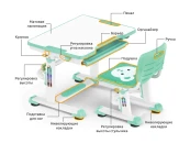 Высота стола регулируется в диапазоне 54-76 см, поэтому, комплект подходит для детей 3 - 14 лет. Высота стола, установленная в соответствии с ростом ребенка, надежно фиксируется специальными винтами с двух сторон. Угол наклона столешницы регулируется до 50 градусов, поэтому можно использовать данный стол, как мольберт, а также во время выполнения заданий можно чередовать положение сидя-стоя, так как в результаты исследований специалистов-ортопедов показали, что это благоприятно влияет на осанку, концентрацию и общее состояние ребенка. Каркас стола оснащен подвижной подставкой для ног, основная задача которой - минимизировать нагрузку на ноги, а также дополнительно увеличивает устойчивость всей конструкции стола. Подставка оснащена рельефной накладкой, которая минимизирует скольжение ног. Также, стоит отметить, что ножки стола со специальными регулируемыми накладками, чтобы нивелировать положение стола (например, если часть стола стоит на ковре, а часть на ламинате).