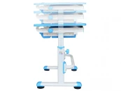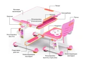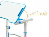 Высота стола регулируется в диапазоне 54-76 см, поэтому, комплект подходит для детей 3 - 14 лет. Высота стола, установленная в соответствии с ростом ребенка, надежно фиксируется специальными винтами с двух сторон. Угол наклона столешницы регулируется до 50 градусов, поэтому можно использовать данный стол, как мольберт, а также во время выполнения заданий можно чередовать положение сидя-стоя, так как в результаты исследований специалистов-ортопедов показали, что это благоприятно влияет на осанку, концентрацию и общее состояние ребенка. Каркас стола оснащен подвижной подставкой для ног, основная задача которой - минимизировать нагрузку на ноги, а также дополнительно увеличивает устойчивость всей конструкции стола. Подставка оснащена рельефной накладкой, которая минимизирует скольжение ног. Также, стоит отметить, что ножки стола со специальными регулируемыми накладками, чтобы нивелировать положение стола (например, если часть стола стоит на ковре, а часть на ламинате).