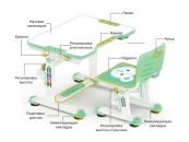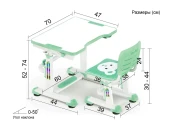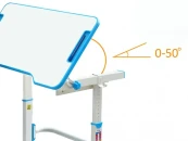 Высота стола регулируется в диапазоне 54-76 см, поэтому, комплект подходит для детей 3 - 14 лет. Высота стола, установленная в соответствии с ростом ребенка, надежно фиксируется специальными винтами с двух сторон. Угол наклона столешницы регулируется до 50 градусов, поэтому можно использовать данный стол, как мольберт, а также во время выполнения заданий можно чередовать положение сидя-стоя, так как в результаты исследований специалистов-ортопедов показали, что это благоприятно влияет на осанку, концентрацию и общее состояние ребенка.