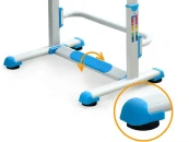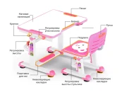 На столешнице, с двух сторон, размещены пеналы для того, чтобы ручки и карандаши были под рукой, и в то же время не мешали во время выполнения занятий. При установке максимального угла наклона, канцтовары не выскальзывают из пеналов. Каркас стола дополнен подвижной подставкой для ног, основная задача которой - минимизировать нагрузку на ноги, а также дополнительно увеличивает устойчивость всей конструкции стола. Подставка оснащена рельефной накладкой, которая минимизирует скольжение ног. Также, стоит отметить, что ножки стола со специальными регулируемыми накладками, чтобы нивелировать положение стола (например, если часть стола стоит на ковре, а часть на ламинате).