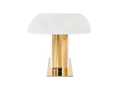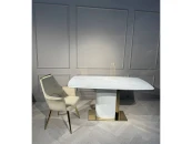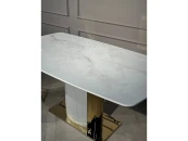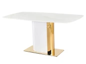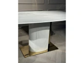 Стильное решение для современной кухни или столовой зоны - обеденный стол со светлой мраморной столешницей. Благодаря изысканному сочетанию светло-серой столешницы под мрамор и комбинированному рифленному подстолью стол выглядит очень элегантно и благородно. Обеденный стол Барнео великолепно впишется в интерьер кухни в современном стиле. Глянцевая поверхность столешницы, рифленая фактура подстолья и завораживающий золотой блеск металла придают изысканный стиль изделию. Столешница - закаленное стекло с полимерным покрытием, цвет: светло-серый. Основание: МДФ, нержавеющая сталь, глянцевое золото.