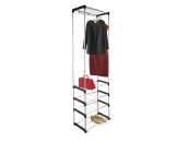 Предусмотрено 9 полок и 5 штанг для вешалок-плечиков. Вы можете спокойно вешать одежду, ставить обувь и хранить все необходимое рядом. Все полки съемные, можно собрать каркас с учетом ваших требований для хранения вещей.