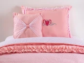 Комплект ROSA для кровати (120 см). Размеры: ширина: 170 см | длина: 230 см. Комплект Rosa отличается стильным дизайном и удобством использования. Благодаря изысканному декору из тюля, комплект может быть использован как отличное завершение комнаты для девочки. Покрывало подходит для кроватей размером 120x200 см. Информация о материале товара : розовая ткань 65% хлопок, 35% полиэстер. Тюль на ткани 100% полиэстер. Материал наполнителя – 100% полиэфирное волокно. Состав товара: пПокрывало 170x230 см. Наволочка 50x70 см. Декоративная подушка 40х40 см. Инструкции по стирке: стирка 300, деликатный режим. Не оставлять в стиральной машине. Не следует использовать отбеливатель. Не следует гладить. Нельзя проводить химчистку.