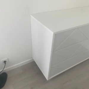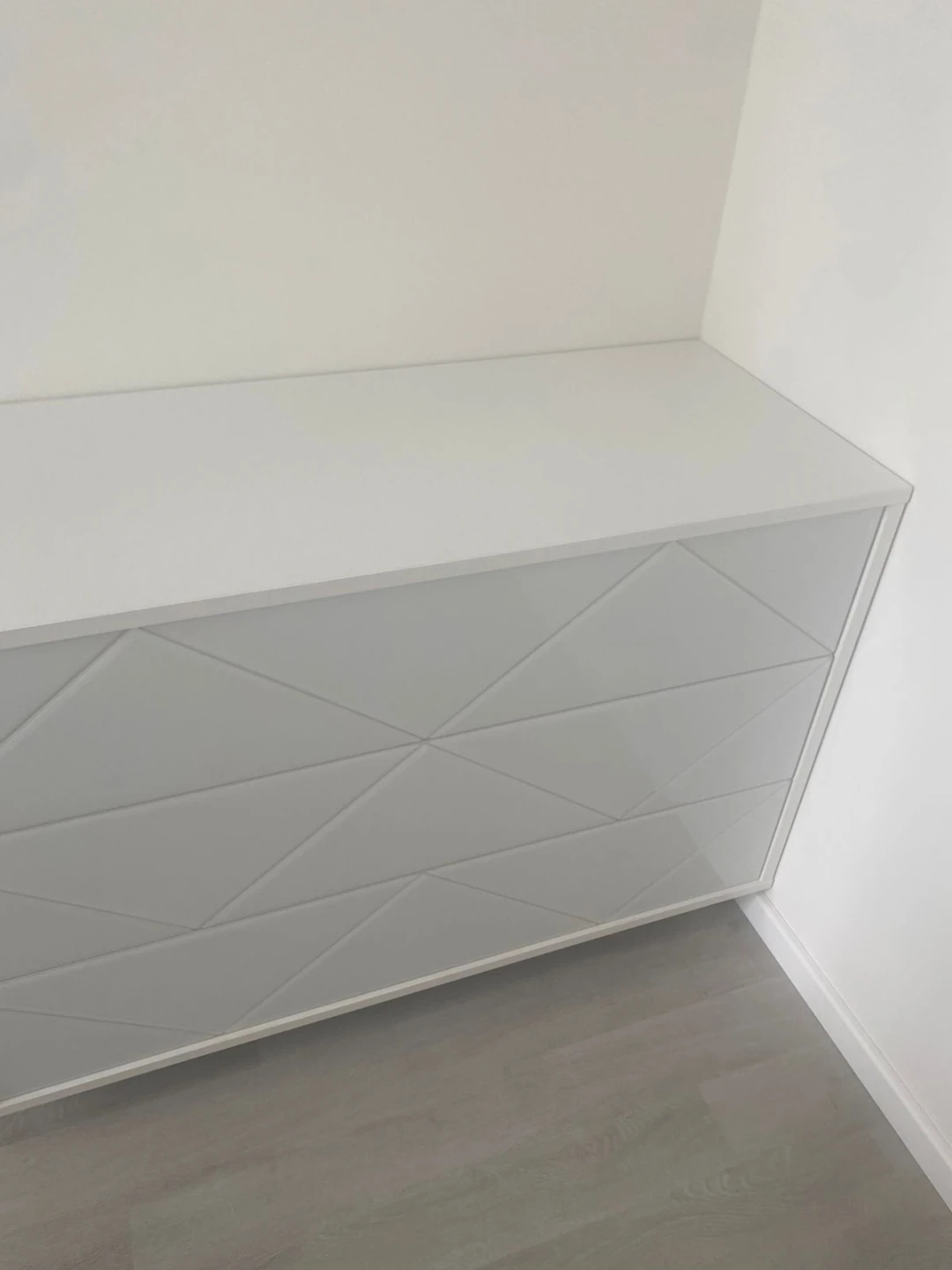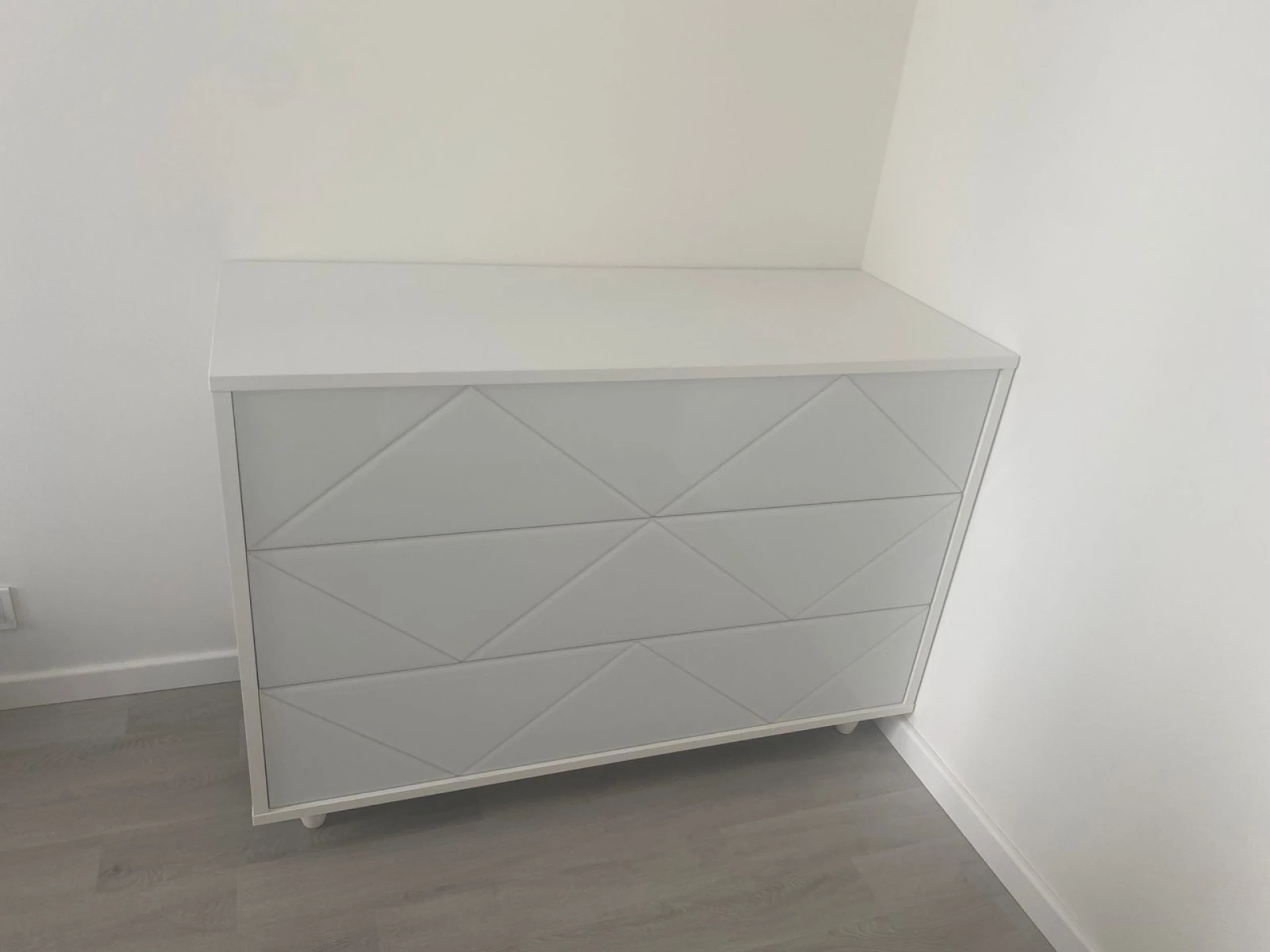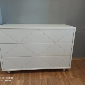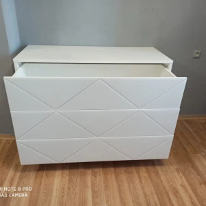 Комод имеет 3 выдвижных ящика. Фасады ящиков декорированы стеклом. Ящики открываются по принципу нажал-открыл. Комод крепится к стене.