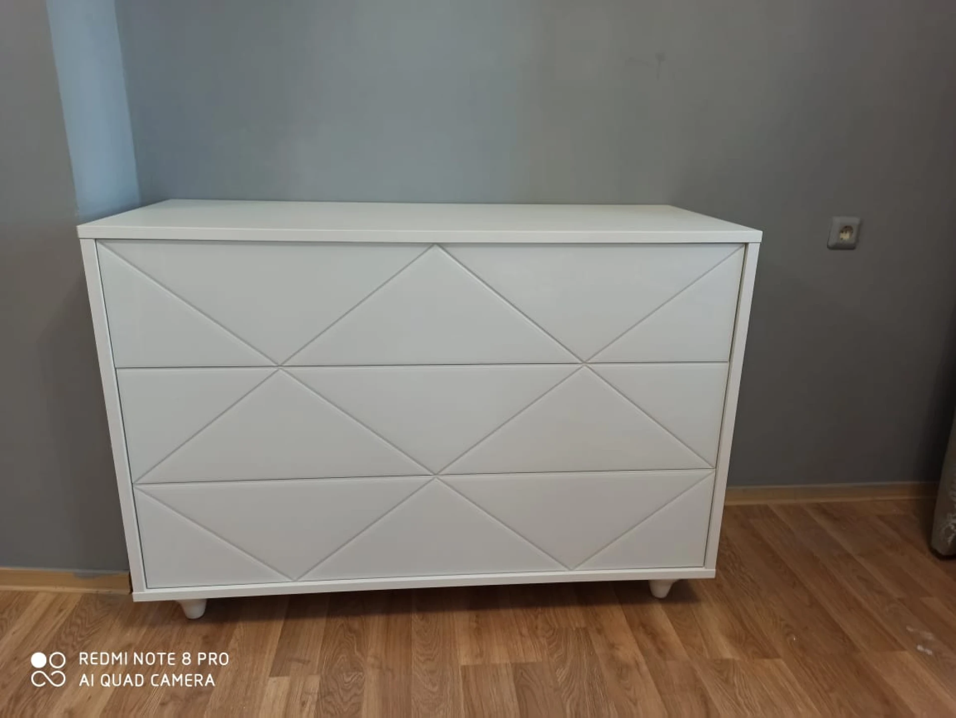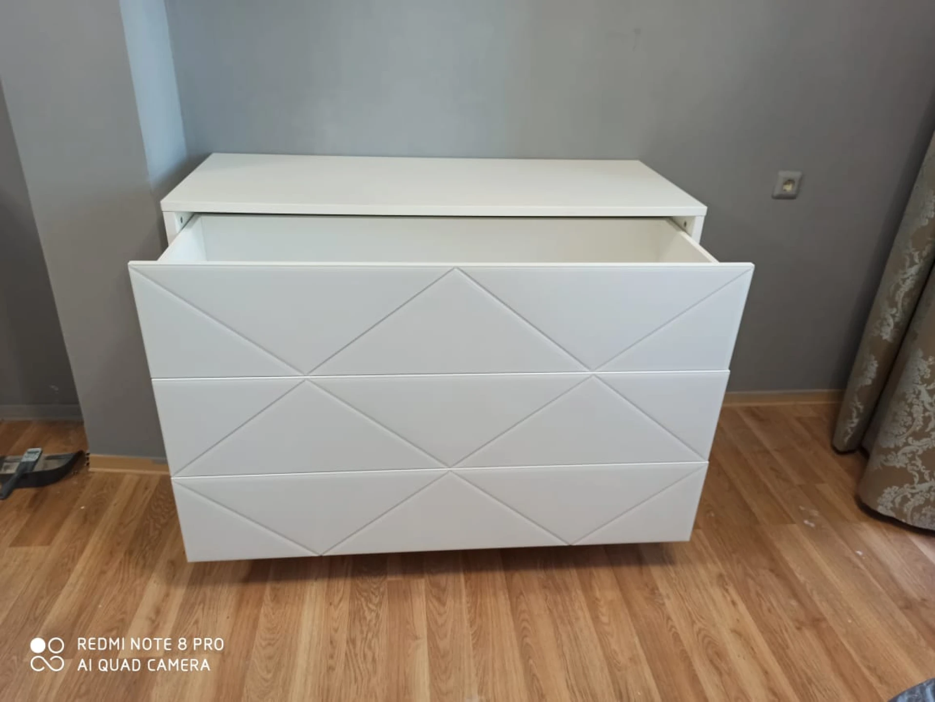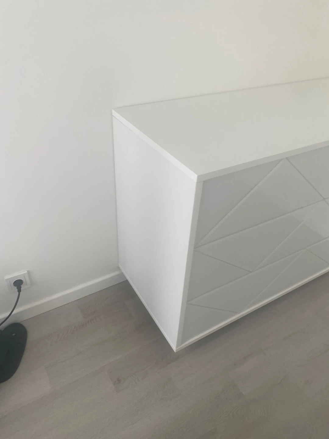 Комод имеет 3 выдвижных ящика. Фасады ящиков декорированы стеклом. Ящики открываются по принципу нажал-открыл. Комод крепится к стене.