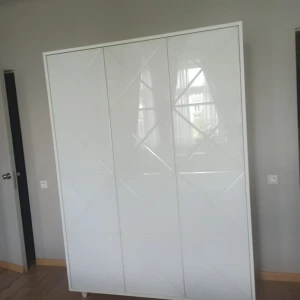 Шкаф оснащен продольной штангой и полкой с одной стороны и 4 полками с другой. Дверцы открываются по принципу «нажал-открыл».