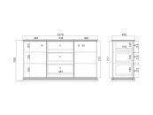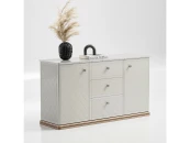 Комод оснащен 3-мя вместительными ящиками и секциями с полками, скрытыми за фасадами, украшенными гравировкой и ручками в четырех видах отделки. Тонированное основание из массива дуба и эмалированная столешница с многогранной ступенчатой фрезеровкой демонстрируют утонченную изысканность дизайна вне времени.