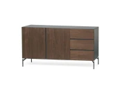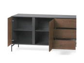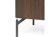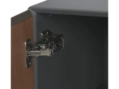Матовый серый каркас создает приглушенный фон для дверей из ореха, добавляя нотку природного тепла и визуального интереса. Гладкие ножки создают заземленный контраст, придавая изделию оттенок индустриального шика.