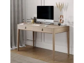 Основательный стол для организации рабочего места. Это стол с правильной прямоугольной формой и двумя вместительными ящиками для бумаг, оригинальными ручками The IDEA из натуральной кожи и неповторимой текстурой дуба, которая просматривается под эмалью.