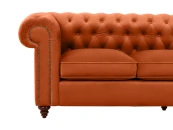 Линейка диванов «Chester Classic» представлена классическими моделями в английском стиле на ножках. Изделие может быть выполнено в натуральной коже или в другой обивке на ваш выбор. Отличительная черта диванов «Chester Classic» — спинка и подлокотники находятся на одном уровне и имеют одинаковую толщину. Благодаря наклону мягкой спинки и независимому пружинному блоку в основании подушек сиденья, «Chester Classic» считается диваном повышенной комфортности. Подлокотники имеют форму свитков. Подобные элементы часто встречаются в архитектуре барокко. Они привносят экспрессию, ощущение королевского стиля. Ножки дивана выполнены из дерева, имеют форму завитка, их цвет может быть коричневым или чёрным — на ваш выбор.||Представленная модель - трехместный диван. Прочный каркас из деревянного бруса, мягкие подушки, наполнитель — пениполиуретан и синтепон. «Chester Classic» превосходно будет смотреться в любой обстановке, гармонично сочетается с фактурой дерева, камня, меха, песка. Выверенное сочетание мягкости и жесткости, комфорт. Яркий гранатовый цвет, как на фото, или шоколадный ликер, ирис, цвет серебра, соснового леса - изделие можно заказать в любом цвете и материале. Диван можно поставить вдоль стены или в центре помещения — он одинаково круто смотрится со всех сторон.