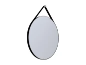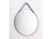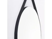Зеркало обтягивает ремень из натуральной кожи чёрного цвета, за который он подвешивается на цилиндрическое хромированное крепление. Торец зеркала обработан - острые края срезаны под углом и отполированы. Это создаёт интересный эффект - под углом по краю зеркала виден равномерный светлый блик на контрасте с черной обводкой. Каркас из окрашенной МДФ. Крепёж в комплекте.