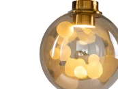 Подвесной светильник из янтарного стекла. Внутри сферы несколько маленьких шариков разного размера из матового стекла. Металлические части цвета латунь.