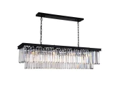 Прямоугольный подвесной светильник на арматуре из металла черного цвета. Плафон состоит из множества подвесок-пластин из прозрачного стекла расположенных на двух уровнях. Размер потолочного крепления 85x12x2,5 см.