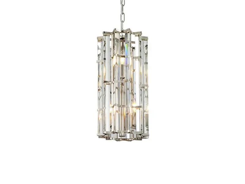 Подвесной светильник с арматурой из металла цвета латунь. По периметру плафона множество стеклянных пластин с треугольным сечением.